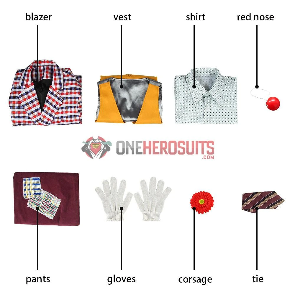 Full Set Includes: blazer, vest, shirt, red nose props, pants, gloves, corsage, tie